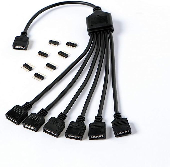 - CABLE: 1 x 11.8 inch black 1 to 6 splitter. Each splitter cable has 6 male pins, 6 RGB outputs. 7 male plug adapters included, when ready to use, insert and assemble.