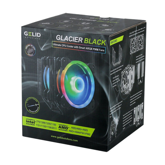 GELID SOLUTIONS Glacier Black RGB - 6 soojustoruga kaksiktorn - 2 120 mm ARGB PWM ventilaatorit - TPD 220 W ja rohkem - AM4 kaitseklamber - CC-Glacier-02-A