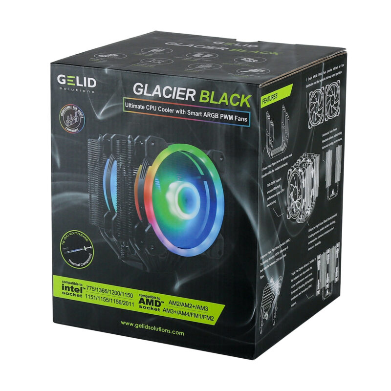 GELID SOLUTIONS Glacier Black RGB - Kaksoistorni 6 teholämpöputkella - 2 120 mm ARGB PWM -tuuletinta - TPD 220 W ja enemmän - AM4 suojakiinnike - CC-Glacier-02-A