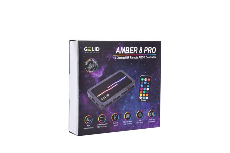 AMBER 8 Pro stjórnar allt að 8 viftum, 10 LED ræmum eða öðrum aðsendanlegum RGB (ARGB) tækjum og státar af 366 forforstilltum, lifandi RGB lýsingarstillingum. Kemur með 21 lykla RF fjarstýringu fyrir þægilega notkun, PWM inntak fyrir óaðfinnanlega PWM stjórn og SATA rafmagnstengi fyrir stöðugt aflgjafa. Þú getur líka stjórnað hraðanum á þessum PWM aðdáendum með RF fjarstýringunni.