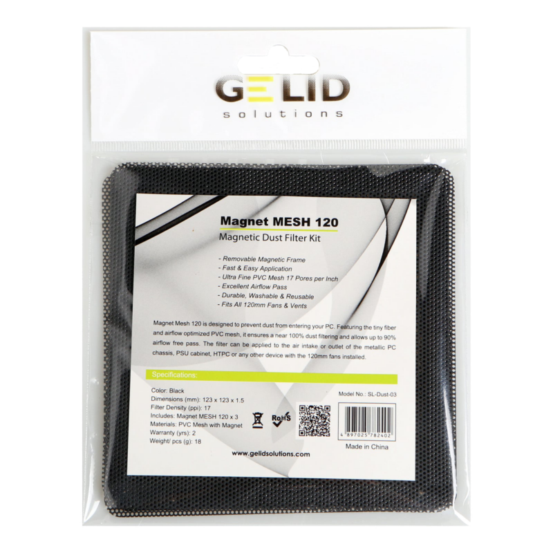 - Dotato di minuscole fibre e rete in PVC ottimizzata per il flusso d'aria con 17 pori densi per pollice, Magnet Mesh 120 garantisce il filtraggio della polvere e consente il passaggio libero del flusso d'aria fino al 90%. È durevole, lavabile, riutilizzabile e compatibile con tutte le ventole e prese d'aria standard da 120 mm.